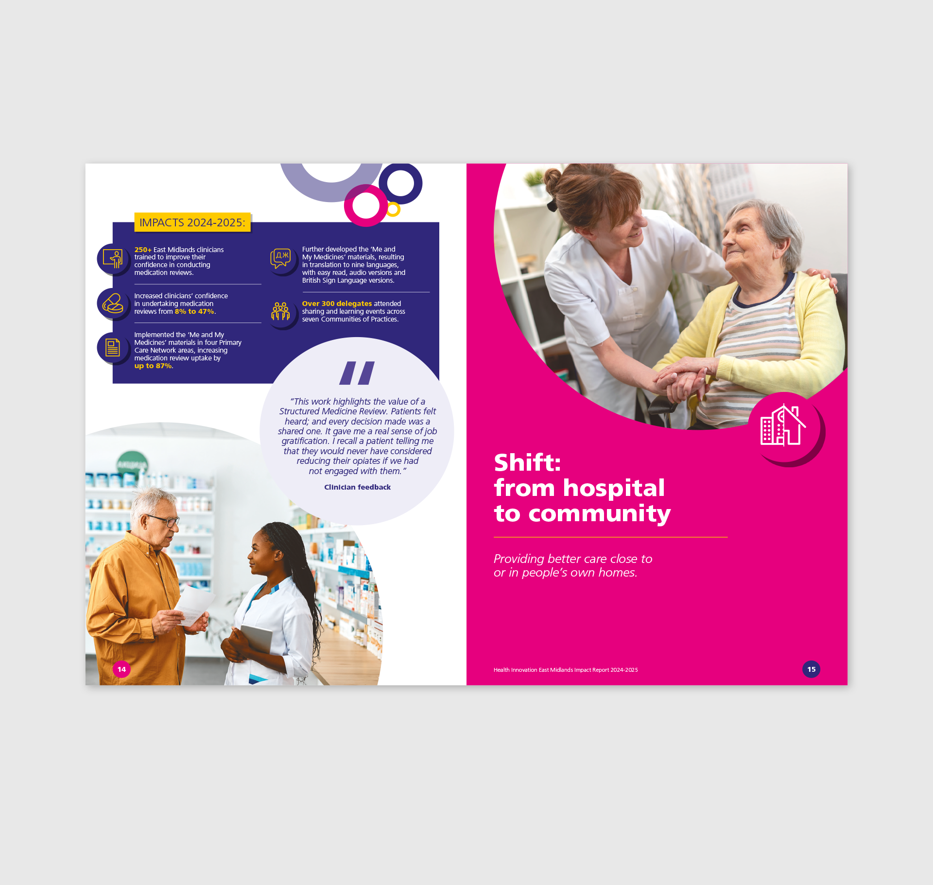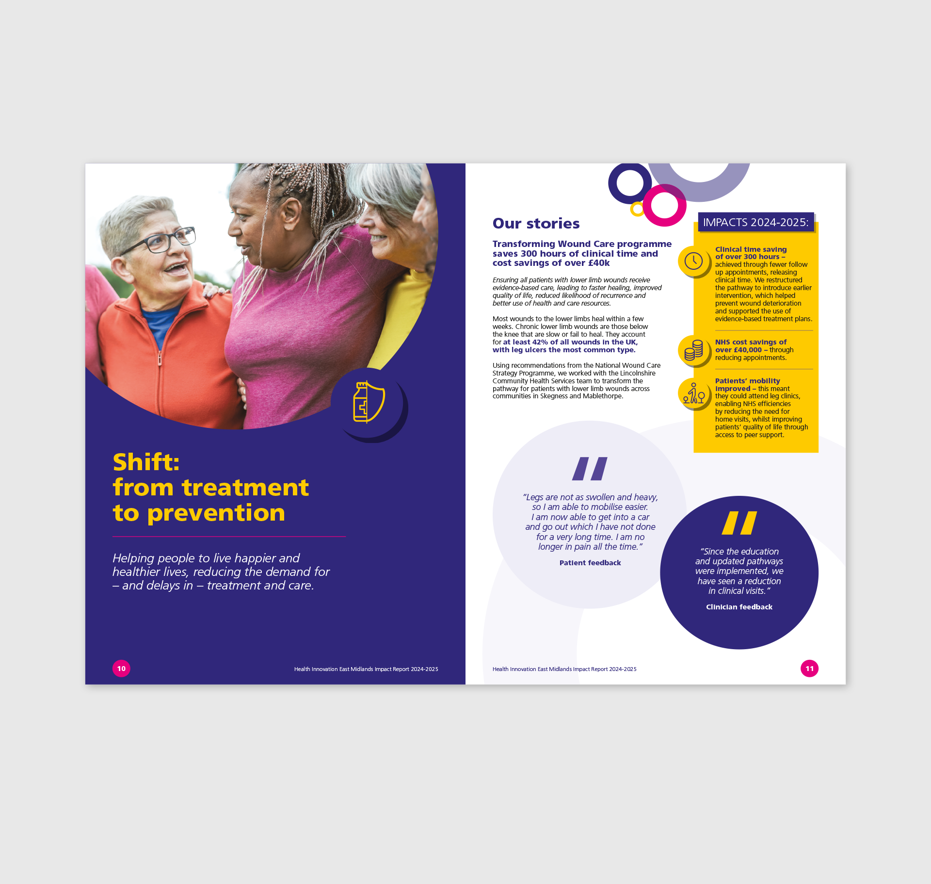 This is an Impact Report publication designed for Health Innovation East Midlands (HIEM). It is an A4, 28 page document that showcases their work to enable healthcare transformation over the previous 12 months. The report was designed to grab the attention and engage the viewer with the areas HIEM affect.